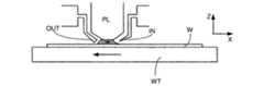 提案された解決策の1つは、液体供給システムが、液体閉じ込めシステムを使用して基板の局部領域上のみに且つ投影系の最終要素と基板との間の中に液体を供給するものである(基板は一般に投影系の最終要素よりも大きな表面積を有する)。このように配置するために提案された1つの方法が、ここで参照によってその全体を援用される国際公開第99/49504号パンフレットに開示されている。図2及び図3で例示するように、好ましくは最終要素に対する基板の移動方向に沿って、液体が少なくとも1つの注入口INによって基板上に供給され、投影系の下方を通過した後に少なくとも1つの排出口OUTによって除去される。即ち、基板を要素の下方で−X方向に走査するとき、液体を要素の+X側で供給し、−X側で除去する。図2は、液体が、注入口INを介して供給され、低圧源に連結する排出口OUTによって要素の他方の側で除去される配置を模式的に示す図である。図2の例示では、液体が最終要素に対する基板の移動方向に沿って供給されるが、これはそうである必要はない。最終要素の周囲に位置決めされた注入口及び排出口の様々な向き及び個数が可能であり、1つの実施例を図3に示すが、そこでは排出口を両側に備える4組の複数の注入口が最終要素の周囲に規則的な様式で設けられている。 One proposed solution is that the liquid supply system supplies liquid only over a local area of the substrate and between the final element of the projection system and the substrate using a liquid confinement system. (The substrate generally has a larger surface area than the final element of the projection system). One method proposed for this arrangement is disclosed in WO 99/49504, hereby incorporated by reference in its entirety. As illustrated in FIGS. 2 and 3, liquid is supplied onto the substrate by at least one inlet IN, preferably along the direction of movement of the substrate relative to the final element, and at least one after passing under the projection system. It is removed by the outlet OUT. That is, when the substrate is scanned in the -X direction below the element, liquid is supplied on the + X side of the element and removed on the -X side. FIG. 2 schematically shows an arrangement in which liquid is supplied via the inlet IN and removed on the other side of the element by the outlet OUT connected to a low pressure source. In the illustration of FIG. 2, liquid is supplied along the direction of movement of the substrate relative to the final element, but this need not be the case. Various orientations and numbers of inlets and outlets positioned around the final element are possible and one embodiment is shown in FIG. 3, where there are four sets of inlets with outlets on both sides Are provided in a regular fashion around the final element.