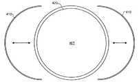 機械加工を容易にするために(数ある理由の中で特に)、流路500の網状構造は、図16に示すように、基板テーブルの平面の中に配置されたほぼ真っ直ぐな穴(ドリル穴であり得る)のアレイを備える。このような真っ直ぐな穴の端部は連結され且つ水密閉鎖されねばならない。これは穴の中に栓を接着することによって実施可能である。しかし、8mmピッチで4mmの穴を備える典型的な構成では、80を超える栓が必要になり得る。数多くの個々の要素を作製する必要がある問題に加えて、このような配置には、流体が全く到達しないか、又は流体が循環しないデッドエンドが生じる恐れが存在する。本発明の一実施例によれば、このような問題は、デッドエンドを生じることなく巧妙な方式で、すべての貫通穴が中に連結可能な環状溝420(図16〜図18に示す)を基板テーブルWTの縁部に設けることによって克服される。このような配置は、流体が基板テーブルWTの縁部により近接して循環可能であるという他の利点も有する。環状溝420は遙かに少ない数の構成要素を使って封止可能である。図示の実施例では封止リング410を使用するが、それは、組付けを容易にするため2つの構成要素に分割され、且つ接着又は他の何らかの標準的な技法によって溝に付着可能である。流体分布の改善によって基板テーブルWTのより均一で且つ制御された冷却が行われ、より効果的な熱管理が可能になり、従って重ね合せが向上する。  For ease of machining (among other reasons), the network of