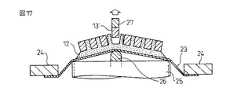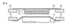 図11において、ローラー22によって第二の接着性シート23を積層体に付着させた後に、必要に応じて、図12に示すように、外部刺激25を与えて第一の接着性シート14の接着力を低下させる。次に、リングフレーム15及び24の距離を遠ざけると、図13に示すように、第一の接着性シート14及び第二の接着性シート23の接着力の差異により、第一の接着性シート14が剥離し、フリップ移載が起こる。  In FIG. 11, after the