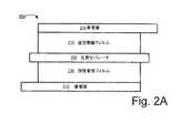 図2Aと図2Bを含む図2はウルトラキャパシタまたは二重層コンデンサで使用できる電極構造体200のそれぞれの断面図を図示する。図2Aで示す電極構造体200の部材は次の順番にアレンジされている。すなわち、第1集電層205、第1活性電極フィルム210、孔質セパレータ220、第2活性電極フィルム230、および第2集電層235である。実施例によっては導電性接着層(図示せず)が電極フィルム210の接着処理に先立って集電層205に成膜される(フィルム230に関しては集電層235)。図2Bで示す二重層210と210Aのフィルムは集電層205に関するものであり、二重層230と230Aのフィルムは集電層235に関するものである。このように二重層コンデンサが形成される。すなわち、両面に炭素フィルムを有した集電層が形成される。さらに孔質セパレータ220Aも含まれる。特にジェリロール型において含まれる。この孔質セパレータ220Aは図示のように上部フィルム210Aに隣接して接着されるか取り付けられ、または底部フィルム230A(図示せず)に隣接して接着されるか取り付けられる。フィルム210と230(および210Aと230A)は図1に関して説明した工程100により得られる活性電極材料の粒体を使用して製造される。電極構造体200を使用した例示的な二重層コンデンサは電解質および電解質を入れる容器、たとえば密封式缶体を含む。電極構造体200はこの容器内に配置され、電解質に浸沈される。多くの実施例では集電層205と237はアルミフォイル製であるが、孔質セパレータ220はセラミック、紙、ポリマー、ポリマー繊維、グラスファイバから選択的に製造でき、電解質溶液は、PCまたはアセトニトリル溶剤等の有機溶液中の1.5Mテトラメチルアンモニウムテトラフルオロボレートを含む。別の電解質例は以下で説明されている。  FIG. 2, including FIGS. 2A and 2B, illustrates a cross-sectional view of an