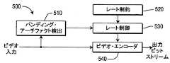 所望のしきい値を超えるバンディング・アーチファクト強度を有するとして識別された領域またはピクチャについて、レート制御アルゴリズム500を使用して、再符号化用の符号化パラメータを調整することができる(図5参照)。このようなレート制御の簡単な例は、バンディング・アーチファクトのない領域またはピクチャのビットを用いて、より多くのビットを、バンディング・アーチファクトを有する領域またはピクチャに割り当てることである。あるいは、バンディング・アーチファクトのしきい値を、再符号化が必要かどうかの判定および/または必要な再符号化の程度の判定をオペレータが判定することができる指標として、提示することもできる。  For regions or pictures identified as having banding artifact strength that exceeds a desired threshold,