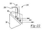 上述したように、種々の照明素子200,210,211,224,240,256は、周辺条件に関係なく、レチクルパターン22を照らすのに十分な光量でレチクルパターン22に供給するために使用されても良い。前述の照明素子200、210、211、224、240、256の各々において、LED202、212、226、242、258からの光または蛍光性ファイバー152からの光は、レチクルパターン22を照らすために、レチクルパターン22に導かれる。各素子200、210、211、224、240、256において、光路206,220,221,238,252,263によって、光は光源からレチクルパターン22へ伝わる。ファイバー204,216,217,232,246,262は、光源からレチクルパターン22へ的確に光を伝える任意の適切なファイバーであっても良い。それぞれの照明素子200または211,210,211,224,240,256のファイバー204,216,217,232,246,262は、レチクルパターン22に対して配置される。光源からの光は、一般にレチクルパターン22の中心に向かって、光路206,220,221,238,252,263から導かれる。照明素子200,210,211,224,240,256からの光は、レチクルパターン22の中心照準点274(図20,23,34,36、および40)を照らすのに一般に十分であるが、全体のレチクルパターン22またはレチクルパターン22の少なくとも一部を強めて照らすために、レチクルパターン22に隣接して第2の光源が配置されても良い。As described above, the