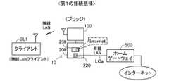 適用例10の方法では、ルータとの接続有りと検出されると、可搬型ネットワーク接続装置の動作がブリッジ機能部として機能する第1の動作モードとなるので、可搬型ネットワーク接続装置をルータが存在するネットワークに接続するときに、可搬型ネットワーク接続装置を介したデータのやりとりを正常に行わせることができる。すなわち、可搬型ネットワーク接続装置及びルータを介してクライアントがデータのやりとりを行う際に、可搬型ネットワーク接続装置はブリッジとして機能するので、ルータが2台存在することを回避できる。したがって、クライアントは、自らの所属するネットワークとは異なるネットワークにデータを送信する際に、いずれの装置をゲートウェイとしてデータを送信するかを特定することができ、データを正常に送信することができる。したがって、適用例10によると、ルータが存在する場合に、可搬型ネットワーク接続装置に適切な役割を果たさせることができる。なお、パケットとは、レイヤ3のパケットに限らず、例えば、レイヤ2フレームなどの任意のレイヤにおける処理単位となるデータのまとまりを含む広い意味を有する。  In the method of the application example 10, when the connection with the router is detected, the operation of the portable network connection device becomes the first operation mode that functions as a bridge function unit. When connecting to a network, the data can be normally exchanged via the portable network connection device. In other words, when the client exchanges data via the portable network connection device and the router, the portable network connection device functions as a bridge, so that the existence of two routers can be avoided. Therefore, when transmitting data to a network different from the network to which the client belongs, the client can specify which device is used as a gateway to transmit data, and can transmit data normally. Therefore, according to Application Example 10, when a router exists, the portable network connection device can play an appropriate role. The packet is not limited to a layer 3 packet, and has a broad meaning including a group of data that is a processing unit in an arbitrary layer such as a