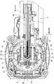 シリンダ12の下部には、ピストン10の下降端位置を規制し、また下降端位置での衝撃を緩和するための円環形状のダンパ27が取り付けられている。このダンパ27の内周孔に整合させてシリンダ12の下面中央には、主としてドライバ11を挿通させるための概ね円形の挿通口12bが設けられている。シリンダ12の下面には、概ね円環形状をなすフロントプレート25が取り付けられている。このフロントプレート25は、3本の固定ねじ26〜26によってシリンダ12の下面に固定されている。このフロントプレート25の内周側と、シリンダ12の挿通口12bを経てドライバ11が下方であって打ち込み部20の打ち込み通路28内へ突き出されている。