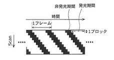 図5は、本発明の実施の形態1に係る表示装置の駆動方法の動作タイミングチャートである。同図において、横軸は時間を表している。また縦方向には、上から順に、k番目の駆動ブロックの走査線133(k、1)、133(k、2)及び133(k、m)、第1信号線151、第2制御線131(k)及び第1制御線132(k)に発生する電圧の波形図が示されている。また、これらに続き、(k+1)番目の駆動ブロックの走査線133(k+1、1)、133(k+1、2)及び133(k+1、m)、第2信号線152、第2制御線131(k+1)及び第1制御線132(k+1)に発生する電圧の波形図が示されている。また、図6は、本発明の実施の形態1に係る表示装置の有する発光画素の状態遷移図である。また、図7は、本発明の実施の形態1に係る表示装置の動作フローチャートである。  FIG. 5 is an operation timing chart of the driving method of the display device according to the first embodiment of the present invention. In the figure, the horizontal axis represents time. In the vertical direction, in order from the top, the scanning lines 133 (k, 1), 133 (k, 2) and 133 (k, m), the