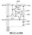 図4は、本発明の実施の形態1に係る表示装置の有する表示パネルの一部を示す回路構成図である。同図には、2つの隣接する駆動ブロック及び各制御線、各走査線及び各信号線が記載されている。図面及び以下の説明では、各制御線、各走査線及び各信号線を“符号(ブロック番号、当該ブロックにおける行番号)”または“符号(ブロック番号)”で表している。  FIG. 4 is a circuit configuration diagram showing a part of the display panel included in the display device according to
