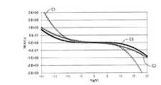 次に、図3を参照しながら、ダイオード素子10の電気特性について説明する。図3は、以下に説明する素子の電圧(V)−電流(I)特性を示すグラフである。図3中の、曲線C1は半導体装置100が有する画素用の酸化物半導体TFTのゲート電圧(V)−電流(I)特性を示す曲線である。曲線C2はダイオード素子10の電圧(V)−電流(I)特性を示す曲線である。曲線C3は、一般的に用いられているアモルファスシリコン(a−Si)層を半導体層として有するショートリング用のダイオード素子(a−Siダイオード素子)の電圧(V)−電流(I)特性を示す曲線である。  Next, the electrical characteristics of the