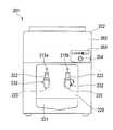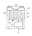 図1〜図4に示すように、飲水器201は略角型形状をした設置型のケーシング202を備えている。このケーシング202の上部は主に貯水室104として構成され、その下部は主に機器収容部105として構成されている。4つのコーナー部分はゴム製のクッション102を設けても良い。Hereinafter, an example of the first embodiment of the present invention will be described with reference to FIGS.