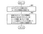 次いで、再生中であるオブジェクトのシステムデータに含まれたモード情報301に基づいて、コアデータ、ブラウザデータ及びプログラムデータのうち何れのデータタイプに該当するかを判断し、判断された結果によって、受信されたユーザ入力情報を、当該モードの再生エンジンが行える実行命令に変換して当該再生エンジンに伝達し、当該コアエンジン、ブラウザエンジンまたはプログラムエンジンを通じてユーザ入力による実行命令を行う(ステップ802)。すなわち、ユーザ入力情報に基づいてオブジェクトの再生を制御することが可能である。  Next, based on the