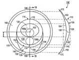 近見視力領域130は回転軸102と実質的に同心であり、遠見視力領域120から外側に向かって放射状に広がる。近見視力領域130はユーザーに近見視力矯正を与える第2の曲率半径を有する。近見視力領域130の面積は、瞳孔106bの大部分を覆うのに充分な大きさである。近見視力領域130は、ユーザーが実質的に水平方向のポイントより下の近見視力ポイントを見ている時(例えば、読書時)に、ユーザーの瞳孔106bが近見視力領域130に実質的に対面するように配置される。遠見視力領域120および近見視力領域130の両方とも、レンズ100の内面104あるいは外面106のいずれかに配設することができる。  The