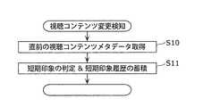 コンテンツ情報取得部10は、テレビにおける視聴コンテンツの変化を検出した場合に、視聴コンテンツの変化前の視聴コンテンツ、すなわち、視聴終了コンテンツのメタデータを取得し、短期印象判定部20および第1のお薦めコンテンツ情報提供部30に送信する。本実施の形態では、メタデータは、EPG(Electronic  Program  Guide)情報から取得する場合を例に説明するが、これに限るものではない。メタデータは、例えば、放送波に重畳されるデータから取得してもよいし、ネットワーク上でコンテンツに関するメタデータを提供するサーバから取得してもよい。  When the change of the viewing content on the television is detected, the content
