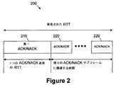 図2は、延長されたRTT200の実施形態を描写する。延長されたRTT200は、第一ACK/NACKサブフレーム210を考慮に入れるHARQメッセージを受信するための時間遅延、およびそれぞれの追加的なACK/NACKサブフレーム220を運ぶため、またそうでなければ提供するための追加的な時間を含む。従って、延長されたRTT200は、1つのACK/NACK返答に関連する時間(および処理の遅延、送信の遅延、など)を含むHARQメッセージを受信するためのRTT、および追加的なACK/NACKサブフレームに関連する時間を含み得る。残りのACK/NACKサブフレームに関連する時間は、繰り返されるACK/NACKサブフレームの全てに関連する時間から、すでに考慮された第一ACK/NACKサブフレームを除外するために1つのACK/NACKサブフレームに関連する時間を引いたものに等しくセットされ得る。  FIG. 2 depicts an embodiment of an extended