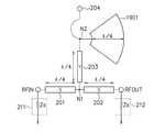 ラディアルスタブ1901は、一端(左端)が第2のノードN2に接続され、他端(右端)が開放状態であり、キャリア信号の周波数に対して1/4波長の長さをもつ扇形の導体である。ラディアルスタブ1901は、第1の実施形態の接地回路に対応する。ラディアルスタブ1901は、1/4波長の長さを有するので、インピーダンス変換を行うことができる。ラディアルスタブ1901の右端が開放状態であるので、ラディアルスタブ1901の左端に接続される第2のノードN2は短絡状態になる。これにより、ラディアルスタブ1901は、図2のシャント容量205と同様の機能を果たすことができる。本実施形態は、第1の実施形態と同様の効果を有する。  The