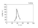図5は、バイアス供給線路203の特性インピーダンスYを変化させた場合の伝送線路201及び202の特性インピーダンスXの最適値を示すグラフである。特性インピーダンスYの値に対して、特性インピーダンスXの最適値は変化する。特性インピーダンスYが大きくなると、特性インピーダンスXの最適値も大きくなる。図2の入力回路のソースインピーダンス211の値Z0及び出力回路のロードインピーダンス212の値Z0は、50Ωである。図1のバイアス回路では、伝送線路101及び102の特性インピーダンスZ0は、ソースインピーダンス211及びロードインピーダンス212の値Z0と同じである。これに対し、図2のバイアス回路の特性インピーダンスXは、ソースインピーダンス211及びロードインピーダンス212の値Z0より小さい。すなわち、第1の伝送線路201の特性インピーダンスXは、入力ノードRFINに接続される入力回路のソースインピーダンス211の値Z0より小さい。また、第2の伝送線路202の特性インピーダンスXは、出力ノードRFOUTに接続される出力回路のロードインピーダンス212の値Z0より小さい。  FIG. 5 is a graph showing the optimum value of the characteristic impedance X of the