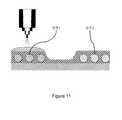 このアプローチの他の利点はセラミック被膜厚さを変更できることである。セラミック被膜の限界アスペクトはその比較的低変形抵抗である。基材形状が変更されるときには被膜は新規形状に適合されなければならず、これは層の割れを与える可能性がある。これらの割れは相当の離層及び結果として粒解離を発生することがある。変形抵抗は薄塗膜を使用することにより強く改良されることができる。溜めのない域は薄くなりそれゆえにより変形に耐えるものである。特定の実施形態において原型ビーズは弱い変形域についてのみ堆積されることができる。高ひずみ域は、図10において示されるようにセラミックだけで塗被されることができる。Prototype deposition using an ink jet method Defining the original particle area and the area without the original particle allows for the formation of a reservoir zone and such a zone without a reservoir (Figure 9). The reservoir area is then loaded with active material, while the non-reservoir area is free of such active material. In the case of coated stents and in certain embodiments, the hollow is only created towards the outside of the stent at the surface that contacts the vessel wall. This arrangement minimizes direct drug diffusion into the bloodstream.