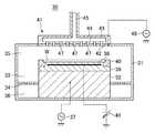 チャンバ31の天井部には、サセプタ32と対向するようにシャワーヘッド41が配置されている。シャワーヘッド41は、上部電極42(構成部品)と該上部電極42を着脱可能に釣支するクーリングプレート43とを有する。上部電極42は多数のガス穴47を有する導電性の円板状部材によって構成されている。クーリングプレート43の内部にはバッファ室44が設けられ、このバッファ室44には処理ガス導入管45が接続されている。上部電極42には第2の高周波電源46が接続されており、該第2の高周波電源46は比較的高い周波数のプラズマ生成用の高周波電圧をサセプタ32に印加する。  A