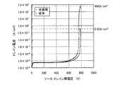 つぎに、素子耐圧について説明する。素子耐圧は、たとえば、ゲートとソースとを短絡し、ドレインに高電圧を印加した場合に、素子に流れる電流密度が1mA/cm2となるソース−ドレイン間電圧とする。図5は、測定回路について示す回路図である。図5に示す回路図によって以下の素子耐圧を測定する。また、図6は、ドレイン電流と、ソース−ドレイン間電圧と、の関係について示す説明図である。図6においては、縦軸はドレイン電流であり、横軸はソース−ドレイン間電圧である。また、●および○のプロットは、それぞれ、実施の形態1にかかる半導体装置および従来の半導体装置の特性を示している。ここで、従来の半導体装置は、超接合型半導体基板100を用いて作製されてはいるが、高濃度領域22のない半導体装置である。Next, the element breakdown voltage will be described. The element breakdown voltage is a source-drain voltage at which the current density flowing through the element is 1 mA / cm2 when, for example, the gate and the source are short-circuited and a high voltage is applied to the drain. FIG. 5 is a circuit diagram showing the measurement circuit. The following device breakdown voltages are measured by the circuit diagram shown in FIG. FIG. 6 is an explanatory diagram showing the relationship between the drain current and the source-drain voltage. In FIG. 6, the vertical axis represents the drain current, and the horizontal axis represents the source-drain voltage. In addition, the plots ● and ○ indicate the characteristics of the semiconductor device according to the first embodiment and the conventional semiconductor device, respectively. Here, the conventional semiconductor device is a semiconductor device which is manufactured using the