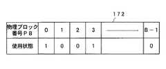 ブロック管理手段170では、空きブロック管理テーブル172を管理しながら半導体記憶装置全体のブロック管理を実施している。図9は空きブロック管理テーブル172の一例であり、各物理ブロックの使用状態を示す。使用状態が1の物理ブロックは使用中、0の物理ブロックは空きブロックで新たに使用できることを示す。 The block management means 170 performs block management of the entire semiconductor memory device while managing the free block management table 172. FIG. 9 shows an example of the free block management table 172, which shows the usage status of each physical block. A physical block whose usage status is 1 indicates that it is in use, and a physical block whose status is 0 is a free block and can be newly used.