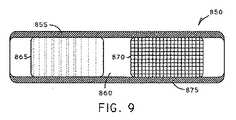 図9は、様々な実施の形態における、分析物濃度測定用センシング素子850の断面図を示す。センシング素子850は、第1の指示素子865及び第2の指示素子870を含む。一実施の形態において、第1の指示素子865は、分析物指示素子であり、第2の指示素子870は、光学的参照目的の、又はより一般的には陰性対照(negative control)としての分析物非感受性素子であり得る。別の実施の形態において、第1の指示素子865は、1つの分析物に特異的であり、一方、第2の指示素子870は、対象となる異なる分析物に特異的である。別の実施の形態において、指示素子865及び870は、指示アレイを形成する分析物感受性及び非感受性素子を含む他の指示素子を伴い得る。いくつかの実施の形態においては、複数の分析物の濃度をセンシングすることができる。いくつかの実施の形態においては、例えば、1〜20の分析物の濃度をセンシングすることができる。  FIG. 9 shows a cross-sectional view of an analyte concentration