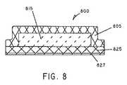 当然のことながら、前記センシング素子は、様々な構造配置を有していてもよい。次に、図8を参照すると、いくつかの実施の形態におけるイオン濃度測定用センシング素子800の断面図が示されている。センシング素子800は、光透過性バッキング層825、バッキング層825の下の接着剤層又は接着層827、膜に付着させた指示素子(indicator element)815、及び被膜層805を含む。  Of course, the sensing element may have various structural arrangements. Referring now to FIG. 8, a cross-sectional view of an ion concentration measuring