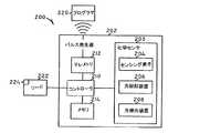 図2は、様々な実施の形態における、集積化学センサ203と共に配置されるパルス発生器202を有する埋込み式システム200を概略的に示す。本明細書において使用されている用語「パルス発生器」とは、ペーシング及び/又はショック治療を送るための電源及び電気回路を含む、心調律管理装置又は神経学的治療装置などの埋込み式システムの一部又は複数部分のことをいう。パルス発生器202は、化学センサ203と通信するコントローラ回路210(パルス発生器回路などのコンポーネントを含む)と、コントローラ回路210及び外部モジュール220(プログラマモジュールなど)と通信するテレメトリ回路212と、コントローラ回路210と通信するメモリ回路214とを含み得る。化学センサ203は、センシング素子204、光励起装置206及び光検出装置208を備えている。埋込み式システム200は、コントローラ回路210(又はパルス発生器回路)を介してパルス発生器202に連結された少なくとも1つの埋込み式リード222を備え、前記少なくとも1つの埋込み式リード222は、組織を電気的に刺激することのできる少なくとも1つの埋込み式電極224に接続されるように構成し得る。しかし、当然のことながら、本発明の実施の形態は、リードのない埋込み式電気除細動器−除細動器といった、ペーシングリードを含まない、心調律管理装置などの埋込み式システムも含み得る。  FIG. 2 schematically illustrates an