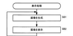 図12は、表示処理の流れを示すフローチャートである。表示処理では、プロセッサ16は、表示部12に表示させる画像を生成する処理(SB1)と、生成した画像を表示部12に表示させる処理(SB2)とを繰り返し実行する。画像を生成する処理では、投影画像を生成する処理と、生成した投影画像と他の画像とを合成する処理が順に行われる。他の画像として常に含まれるのはインジケータIAおよびIBである。投影画像を生成する処理は、プレイヤが殴り動作を行った場合には、投影される仮想空間内にプレイヤのキャラクタの拳を配置した上で行われる。また、他の画像には、照準画像AAL、AAR、ABLおよびABRのうち少なくとも一つが含まれうる。具体的には、これらの照準画像のうち、照準位置が画面3内にあるもののみが他の画像に含まれる。照準位置が画面3の内にあるか外にあるかは、プロセッサ16が当該照準位置の座標に基づいて判断する。具体的には、プロセッサ16は、RAM14の照準位置領域に記憶されている照準位置の座標が(0,0,0)の場合には当該照準位置が画面3外にあると判断し、他の場合には当該照準位置が画面3b内にあると判断する。  FIG. 12 is a flowchart showing the flow of display processing. In the display process, the