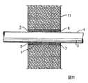 図21は導路1に熱弱化可能な材料製の管3が貫通しているパーティション11を示す。図22に示すように、この方法の一工程は非線形熱膨張特性(図示しない)を有する少なくとも1つの成分を含む装置5を適用することを含む。装置5は管3の周りに事実上同心円状に適用される。装置5は図22に示すようにスリーブの形をしており、管3の周りにスリーブを都合よく操作するためのスリット13を有していてもよい。図23に概略を示すように、スリーブを操作して管3の周りに配すると、この管が導路1内に押込まれる。好ましくは、このスリーブは導路の中央に行き着き、導路の各端部には依然としてシーラント9が占めることができる空間の存在を許容し、そのためシーラント9は導路1に入り、パーティション11と同一面になる。図24は装置6を管3の周りに同心円状に適用した最終結果を示す。装置6の配置は、装置の非線形熱膨張の開始前に、熱ガスが装置6と導路1の内壁2との間の熱ガス入口空間内に入ることができるように、配置されている。  FIG. 21 shows a