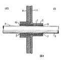 導路1の直径は管3の直径に対して比較的に小さい。好ましくは、管3の外径は導路1の内径の50%より大きい。さらに好ましくは、管の外径は導路1の内径の60%より大きい。管の外径が導路1の内径の70%より大きいときにさらなる最適化が達成される。もちろん、管3の外径が導路1の内径に対して大きいほど、より大きな空間が確保される。図1〜10に示すパーティション10は金属合金製、一般的には鋼、アルミニウムまたは銅合金製であってもよい。しかしながら、図11〜20に示すように、パーティション自体は石もしくはコンクリート壁、床または天井を包含してもよい。その場合、導路1はおそらく石またはコンクリート壁の貫通孔からなる。パーティションが石またはコンクリート壁であるとき、通常は断熱材料がパーティション1のいずれの側にも適用されない。  The diameter of the