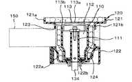 図8に示すように、下部筒体122の下端側は、駆動用歯車110の細径部110c(図10参照)に合わせて、先細りした細径部122aとなっており、この細径部122aの内周壁は、前記細径部110cの係止歯116の外周に沿うように設定されている。また、下部筒体122の細径部122aの底部の中心部には、回転軸134用の軸受け部122bが装着されている。  As shown in FIG. 8, the lower end side of the lower