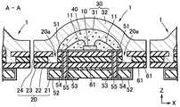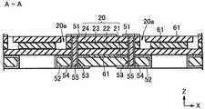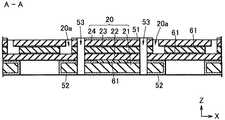 積層基板20は、第1基板21、第2基板22、第3基板23、及び第4積層基板24を順次積層したものである。第1基板21は、他の基板より横幅が狭く、第1基板21と第2基板22との間に矩形の段差が形成されている。第3基板23と第4基板24とにはそれぞれ切断部分があり、互いに連通して溝部20aを形成している。溝部20aは、積層基板20の上面20bに開口している。第2基板22には溝部20aと連通する切断部分はないので、溝部20aの底部が第2基板22の上面になる。