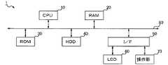CPU10は演算手段であり、情報処理端末全体の動作を制御する。RAM20は、情報の高速な読み書きが可能な揮発性の記憶媒体であり、CPU10が情報を処理する際の作業領域として用いられる。ROM30は、読み出し専用の不揮発性記憶媒体であり、ファームウェア等のプログラムが格納されている。HDD40は、情報の読み書きが可能な不揮発性の記憶媒体であり、OS(Operating  System)や各種の制御プログラム、アプリケーション・プログラム等が格納される。  The CPU 10 is a calculation means and controls the operation of the entire information processing terminal. The