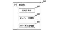図4に示すように、フロー制御部116は、情報取得部161、プレビュー処理部162及びフロー実行処理部163を含む。情報取得部161は、ユーザによるワークフローの実行指示等の操作情報、スキャンの結果生成された画像情報、実行すべきワークフローの情報等、ワークフローの処理に関する様々な情報を取得する。  As illustrated in FIG. 4, the