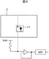 OLED素子11の特性検出は図4の検出部7によって行なわれる。OLED素子特性の検出方法は例えば、図6または図8のような方法がある。図6は検出部7に定電流源を設置している場合である。すなわち、検出部7に存在する定電流源から検出線6を通して測定画素に定電流が供給される。OLED素子11が劣化するとOLED素子11の抵抗が大きくなるためにOLED素子11の端子間電圧が上昇する。すなわち、OLED素子11の陽極電圧が上昇する。この陽極電圧を差動増幅器によって検出する。この陽極電圧をアナログ―デジタルコンバータADCによってデジタルデータに変換し、このデータを図4に示す第1メモリMR1に保存する。第1メモリMR1には1ライン分の画素PXの検出結果が蓄積される。  The characteristic detection of the