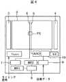 図4は本発明が実施される有機EL表示装置の例である。図5は図4の画素PXの構成例である。表示領域2には多数の画素PXがマトリクス状に配置されている。各画素には陽極と陰極と、その間に挟まれた有機EL発光層を有するOLED素子11と、これを駆動する薄膜トランジタ(TFT)、蓄積容量等が存在している。表示領域2の左側には画面を行毎に走査して画像を形成する表示用走査回路3が設置されている。すなわち、選択した行に信号駆動回路から画像データが供給される。  FIG. 4 is an example of an organic EL display device in which the present invention is implemented. FIG. 5 is a configuration example of the pixel PX in FIG. A large number of pixels PX are arranged in a matrix in the