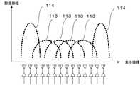 図5は、従来のアンテナ装置の各増幅器の送信電力分布を説明するための説明図である。図5において、103は各増幅器の送信電力分布である。送信電力分布103は、フィードアレーの開口中心付近の送信電力が大きく、フィードアレーの開口端部付近での送信電力が小さくなる分布となる。つまり、図5によれば、従来のアンテナ装置では、単一種類の増幅器を用いた場合に、フィードアレーの開口端部付近の増幅器の電源効率が開口中心部分よりも大きく低下していることがわかる。  FIG. 5 is an explanatory diagram for explaining the transmission power distribution of each amplifier of the conventional antenna apparatus. In FIG. 5,