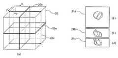 図3(b)〜(d)に示すように、3次元画像空間20における各断面像21a、21b、21cは、医用画像データを座標軸に平行な面20a、20b、20cで切断した画像である。各断面20a、20b、20cは、それぞれ「Axial断面」、「Sagittal断面」、「Coronal断面」と呼び、各断面像21a、21b、21cは、それぞれ「Axial断面像」、「Sagittal断面像」、「Coronal断面像」と呼ぶ。  As shown in FIGS. 3B to 3D, the