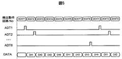 次に、図5を用いて本発明第1の実施例における座標入力装置の動作シーケンスを説明する。本発明第1の実施例における座標入力装置では、各センサ電極の容量を順次検出する。図5ではTP_X1電極からTP_X4電極、TP_Y1電極からTP_Y4電極へと順次検出するが、検出順序はこれに限らない。各検出動作回路の検出方法は、図2に示したように1回の充放電による検出でもよいし、図3に示したようにn回の充放電による検出でもよい。これらは、座標入力装置としての入力検出速度に依存して設計される項目である。各容量検出回路の出力信号はAD変換タイミング信号ADTに応じて、デジタル信号DATAを出力する。よって、DATAは各センサ電極の容量検出結果がシリアルで出力されることになる。 Next, the operation sequence of the coordinate input device according to the first embodiment of the present invention will be described with reference to FIG. In the coordinate input device according to the first embodiment of the present invention, the capacitance of each sensor electrode is sequentially detected. In FIG. 5, the detection is sequentially performed from the TP_X1 electrode to the TP_X4 electrode and from the TP_Y1 electrode to the TP_Y4 electrode, but the detection order is not limited to this. The detection method of each detection operation circuit may be detection by one charge / discharge as shown in FIG. 2, or may be detection by n charge / discharge as shown in FIG. These are items designed depending on the input detection speed as the coordinate input device. The output signal of each capacitance detection circuit outputs a digital signal DATA according to the AD conversion timing signal ADT. Therefore, DATA outputs the capacitance detection result of each sensor electrode serially.