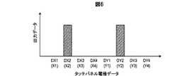 図6は、図4に示す座標入力部101において、タッチによる容量増加がFAの1箇所で発生した場合の、各センサ電極の容量検出結果である。タッチがFAの箇所で発生した場合には、センサ電極TP_X2とTP_Y2で入力容量が増加するため、これらに対応するデジタル信号DX2とDY2のデジタル信号が高くなり、これらのセンサ電極に対応する座標に入力があったと判定できる。  FIG. 6 shows a capacitance detection result of each sensor electrode in the coordinate