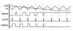PWMコンパレータ5は、非反転入力端(+)に印加されるスロープ電圧SLと、反転入力端(−)に印加される誤差電圧ERRを比較して比較信号CMPを生成し、これを論理和演算器8の第1入力端に出力する手段である。図2は、トランジスタ11のオン/オフ制御に用いられるパルス信号PWMの生成動作を説明するためのタイミングチャートである。なお、図2では、上から順に、誤差電圧ERR、スロープ電圧SL、比較信号CMP(RSフリップフロップ9のリセット信号R)、クロック信号CLK(RSフリップフロップ9のセット信号S)、及び、パルス信号PWM(RSフリップフロップ9の出力信号Q)が描写されている。図2に示す通り、スロープ電圧SLが誤差電圧ERRよりも高いときには、比較信号CMPがハイレベルとされ、スロープ電圧SLが誤差電圧ERRよりも低いときには、比較信号CMPがローレベルとされる。  The PWM comparator 5 compares the slope voltage SL applied to the non-inverting input terminal (+) and the error voltage ERR applied to the inverting input terminal (−) to generate a comparison signal CMP, and performs an OR operation on the comparison signal CMP. Means for outputting to the first input terminal of the