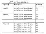ここで、「Pattern2」で表示されるガイダンス表示パターンは、操作ガイダンス表示情報管理部108の管理するガイダンス表示パターン402の一つとして定義され、ガイダンス表示パターン402の「パターン名」列として定義される。例えば、ガイダンス表示パターン402のPattern2では、ボタン型の画像データの上にX1で示される文字列を表示し、次に、矢印を示す画像データ上にX2で示される文字列を表示し、最後にボタン型の画像データ上にX3で示される文字列を表示することを定義している。また、これらの画像データ及び文字データの表示位置は、ガイダンス表示パターン402の「表示位置」列に記載されたシンボル情報から、入力装置情報管理部104で管理する入力情報変換テーブル(図2)の「配置情報」を得て、各シンボルで意味づけられる入力装置101のボタンやキーなどの相対位置を得ることにより決定される。  Here, the guidance display pattern displayed as “Pattern2” is defined as one of the guidance display patterns 402 managed by the operation guidance display
