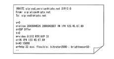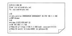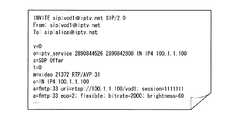 その他の違いとしては、11行目の「a=fmtp:33  uri=...;  session=」の行である。ここでパラメータとして返されたものは、再生開始や再生一時停止などのビデオ再生制御リクエストを送る際に使われる識別子である。識別子としては「uri=rtsp:〜」のようにRTSP(Realtime Streaming Protocol;RFC2326)を用いたが、特にこれに限定するわけではなく、再生制御を行うことの出来る任意のプロトコルでよい。また、「uri=rtsp://100.1.1.100」で指定されているIPアドレス「100.1.1.100」は、コンテンツ配信装置4のアドレスであり、通常図7のSIPメッセージの送信先と同じである。しかし、コンテンツ配信装置4の構成によっては、SIPメッセージを送受信するサーバー装置と、RTSPメッセージを送受信するサーバー装置が異なる場合もあり、その場合には異なるIPアドレスになることもある。  Another difference is the line “a = fmtp: 33 uri =... Session =” on the eleventh line. Here, what is returned as a parameter is an identifier used when sending a video playback control request such as playback start or playback pause. As the identifier, RTSP (Realtime Streaming Protocol; RFC2326) is used like “uri = rtsp: ˜”, but it is not particularly limited to this, and any protocol that can perform playback control may be used. Further, the IP address “100.1.1.100” specified by “uri = rtsp: //100.1.1.100” is the address of the