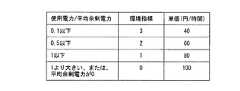 すなわち、平均余剰電力に対して、使用電力が非常に小さく割合が0.1以下の場合、省エネに対する貢献度が高いと言うことで、環境指標3とし、単価は1時間あたり40円である。また、平均余剰電力に対する使用電力の割合が0.1を超えて0.5以下の場合、環境指標2とし、単価は1時間あたり60円である。平均余剰電力に対する使用電力の割合が0.5を超えて1以下の場合、環境指標1とし、単価は1時間あたり80円である。平均余剰電力に対する使用電力の割合が1を超えている、あるいは、平均余剰電力が0の場合、環境指標0とし、単価は1時間あたり100である。但し、これらの設定は、事業者の運用方針により任意に設定できるものである。  That is, when the power consumption is very small with respect to the average surplus power and the ratio is 0.1 or less, the contribution to energy saving is high, so that it is set as the