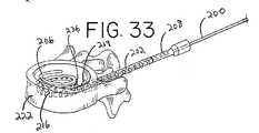 本発明のさらなる態様は、ヒトの椎骨の椎体に導入された流動性を有する材料の動きを制限する装置に関する。一実施形態において、装置は、概して細長い部材を椎体へ案内する、少なくとも1つの案内部材から構成される。案内部材は、近位端および遠位端を有する。案内部材の遠位端部分は、椎体への挿入に適し、所望の障壁の形状をその中に規定する。細長い部材は、椎体への挿入のために細長い部材を案内部材に沿って遠位に進める案内部材の上に、スライド可能に取り付けられる。細長い部材は、案内部材の遠位端部分によって規定される形状に実質的に一致し、椎体内に導入される流動性を有する材料の動きを制限し、または導くよう構成された障壁を形成する。 A further aspect of the present invention relates to an apparatus for restricting the movement of fluid material introduced into the vertebral body of a human vertebra. In one embodiment, the device is comprised of at least one guide member that generally guides the elongate member to the vertebral body. The guide member has a proximal end and a distal end. The distal end portion of the guide member is suitable for insertion into the vertebral body and defines the desired barrier shape therein. The elongate member is slidably mounted on a guide member that advances the elongate member distally along the guide member for insertion into the vertebral body. The elongate member substantially conforms to the shape defined by the distal end portion of the guide member and forms a barrier configured to limit or guide the movement of the flowable material introduced into the vertebral body. To do.
