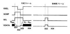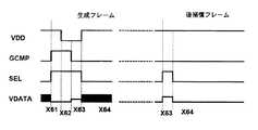 各セグメントについてVT生成サイクルが行われることから、VT生成サイクルに割り当てられる時間がセグメント内の行数倍に拡張され、より精密な補償をもたらす。a‐Si:TFTの漏れ電流が小さい(たとえば10‐14台)ことから、生成されたVTをキャパシタ内に蓄積し、ほかのいくつかのフレームに使用することができる。その結果、次の後補償フレームの間の動作サイクルがプログラミングおよび駆動サイクルに還元される。したがって、外部ドライバに、および寄生キャパシタンスの充電/放電に関連付けされる電力消費が同じいくつかのフレームの間で分割される。Since aVT generation cycle is performed for each segment, the time allotted to theVT generation cycle is extended to the number of rows in the segment, resulting in more precise compensation. Since the leakage current of the a-Si: TFT is small (for example, 10−14 units), the generated VT can be stored in the capacitor and used for some other frames. As a result, the operating cycle during the next post-compensation frame is reduced to the programming and driving cycle. Thus, the power consumption associated with the external driver and the charging / discharging of the parasitic capacitance is divided between the same several frames.