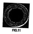 図10と11に示されているプリフォームは、フィルム沸騰緻密化プロセスにおける従来の銅管誘導コイルで形成された。どちらの画像でも、円周方向に伸びた密度変化領域が認められる。特に、非常に低密度の領域(両方のプリフォームのほぼ“10時位置”における白い領域に対応)が顕著である。更に、上述したように、不十分な緻密化が、例えばプリフォームの半径方向外方周辺に見られる。例えば、各X-線スキャンのほぼ下半分に沿った白い領域を見よ。 The preform shown in FIGS. 10 and 11 was formed with a conventional copper tube induction coil in a film boiling densification process. In both images, a density change region extending in the circumferential direction is recognized. In particular, a very low density area (corresponding to the white area at approximately “10 o'clock” for both preforms) is noticeable. Furthermore, as mentioned above, insufficient densification is seen, for example, in the radially outward periphery of the preform. For example, look at the white area along the lower half of each x-ray scan.