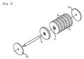 前記円板ディスクと前記円板ディスクとの間にはこれらの間隔を維持するためのリテーナー19が設置されるが、前記リテーナー19の両面には金属板の外面へ突出する補強樹脂物の厚さが挿入されるべき深さを持つように溝20を凹設し、前記20の縁の段差部21には先鋭な微細突起22を均等な間隔で多数突設している。  A