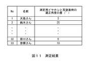 この傾斜角度設定方法では、上述の傾斜角度AR2の測定を任意の33人に対して行い、その測定結果を図11に示す表に纏め、傾斜角度AR2の平均値を求めた結果、傾斜角度AR2の平均値が7[°]となり、測定用イヤホン装置8の傾斜角度40[°]から傾斜角度AR2の平均値7[°]を減算し、音導管4の傾斜角度AR1を33[°]と設定するようになされている。  In this inclination angle setting method, the above-described inclination angle AR2 is measured for any 33 persons, the measurement results are summarized in the table shown in FIG. 11, and the average value of the inclination angle AR2 is obtained. As a result, the inclination angle AR2 is obtained. And the average value 7 [°] of the tilt angle AR2 is subtracted from the tilt angle 40 [°] of the