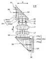 或いは、温度変化時の屈折率変化が小さいプラスチック複合部材にて、入射側プリズム101、像面側プリズム102及びその他の光学レンズを構成することが望ましい。このようなプラスチック複合部材として、プラスチック材料中に無機微粒子を分散配合してなる部材を用いることができる。  Alternatively, it is desirable to configure the