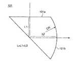 ゲート痕Ge1、Ge2をそれぞれの不使用面101m、102mに設けることで、複屈折等の影響を低減できるとはいえ、完全にその影響を取り除くことは難しい。このような、ゲート痕Ge1、Ge2近傍の光学特性に影響を与えるような領域を、図10においてそれぞれゲート影響領域Ge1m、Ge2mとして示している(図中のハッチング部位が相当する)。 Although the gate traces Ge1 and Ge2 are provided on the non-use surfaces 101m and 102m, the influence of birefringence and the like can be reduced, but it is difficult to completely remove the influence. Such regions that affect the optical characteristics in the vicinity of the gate traces Ge1 and Ge2 are shown as gate-affected regions Ge1m and Ge2m in FIG. 10 (corresponding to hatched portions in the figure).