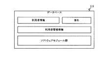 図2に示したデータベース113には図3に示すように、利用者情報と、署名と、ソフトウェアモジュール群と、利用者管理情報とが格納されている。これらの情報の詳細については、後述する。  As shown in FIG. 3, the